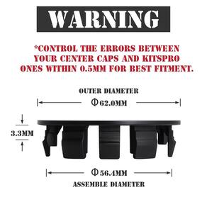 KitsPro As tampas centrais das rodas são projetadas para substituir as tampas antigas, quebradas ou ausentes com fácil instalação. Todas as tampas centrais das rodas são feitas de materiais resistentes ao calor e impactos que foram testados para garantir um ajuste seguro e reforçado. Cada conjunto contém 4 peças de tampas centrais de roda. Certifique-se de que o tamanho das tampas centrais da roda corresponde ao seu. ||Parâmetro do produto: 1).Diâmetro externo: 6.1 cm 62mm; 2).Diâmetro da montagem: 5.6 cm 56mm; 3).Comprimento do clipe: 0.5 cm 5mm. - Dicas quentes: confirme o tamanho do orifício do aro da roda porque este produto pode não servir! Se você não tiver certeza de como medir o tamanho, você pode assistir ao vídeo anexado neste link; você também pode entrar em contato conosco e recomendamos o produto que se adapta às suas rodas. - Diâmetro externo: 62,0 mm dentro de 0,5 mm de erro - DIÂMETRO DE MONTAGEM INTERNA: 56,4 MM dentro de 0,5 mm de erro - Diâmetro do clipe: erro de 3,3 mm dentro de 0,5 mm - Matéria-prima: ABS industrial, resistente a ácidos, resistente a riscos e resistente a altas temperaturas
