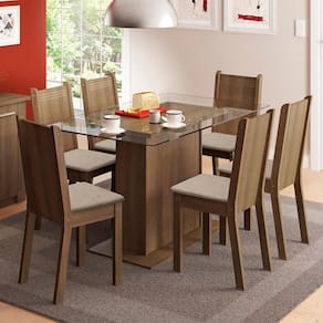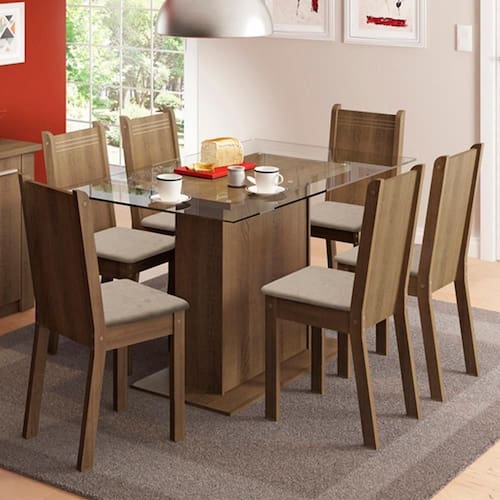 - Itens Inclusos: 1 mesa retangular com estrutura em MDP e tampo de vidro e 6 cadeiras com estrutura em MDF