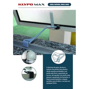 Desenvolvido para ser utilizado nas janelas basculantes do tipo máximo-ar, seja na sala, no banheiro, nas escadas, nos corredores de circulação, nas áreas comuns dos edifícios, em casa, no escritório, na empresa. Produzido em abs, o mesmo material plástico dos para-choques de veículos. Possui aditivo uv, que protege a peça da ação dos raios ultravioletas; e elastômero, que dá flexibilidade suficiente à peça para sua adequada instalação e utilização. O tamanho do klypo é medida única e perfeita para uma abertura suficiente e com segurança do basculante.