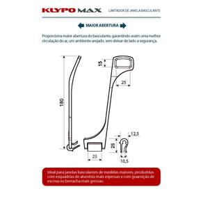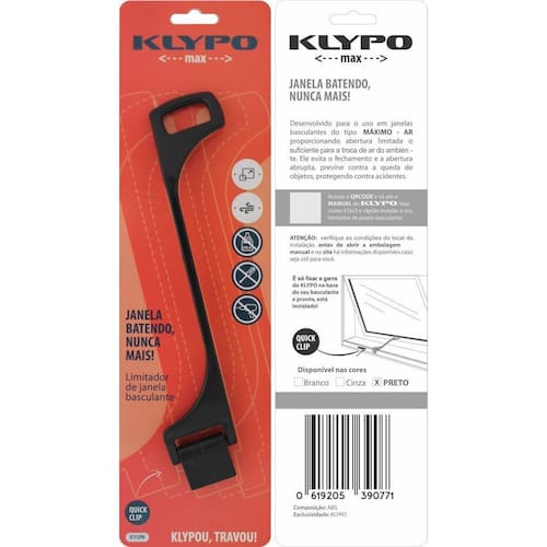 Desenvolvido para ser utilizado nas janelas basculantes do tipo máximo-ar, seja na sala, no banheiro, nas escadas, nos corredores de circulação, nas áreas comuns dos edifícios, em casa, no escritório, na empresa. Produzido em abs, o mesmo material plástico dos para-choques de veículos. Possui aditivo uv, que protege a peça da ação dos raios ultravioletas; e elastômero, que dá flexibilidade suficiente à peça para sua adequada instalação e utilização. O tamanho do klypo é medida única e perfeita para uma abertura suficiente e com segurança do basculante.