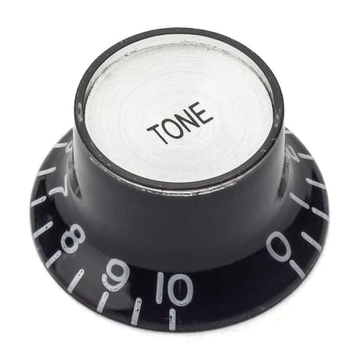 Knob (botão) de plástico em acabamento preto com topo cromado e indicação para potenciômetros de Tonalidade, 3 unidades, comumente utilizado nos modelos de guitarras Gibson, entre outras. Spirit Guitar Parts - KSG-TON-BKCR.