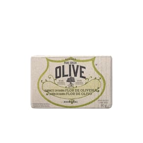 Sabonete em barra cremoso. Korres Flor de Oliva higieniza e macia com hidratação e aroma suave.
