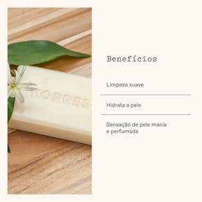 Sabonete em barra cremoso. Korres Jasmim higieniza a pele com sua espuma macia e perfuma com leveza.