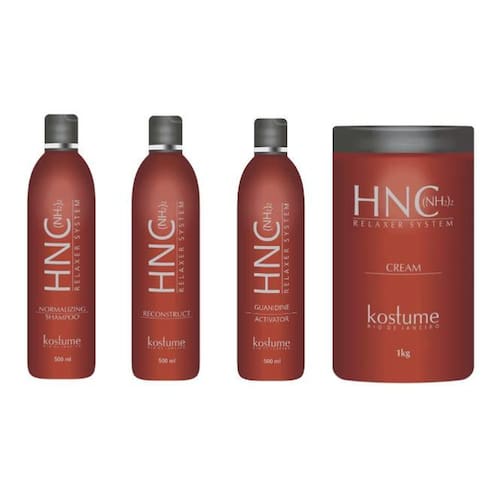 Kostume KIT HNC Relax Guanidina 4 passos Relaxamento e alisamento a base de guanidina, que transforma seus cabelos crespos em super lisos, além de proporcionar brilho, maciez, leveza e sedosidade aos fios. Relaxamento, alisamento e nutrição em um só sistema.