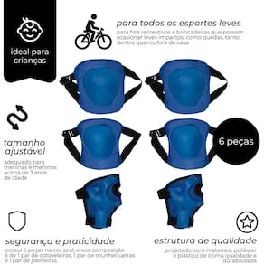 ESTRUTURA DE QUALIDADE: O kit de proteção infantil foi projetado com materiais: poliéster e plástico de ótima qualidade e durabilidade. Adota uma casca de PP robusta e almofadas internas que tem forte resistência ao impacto e efeito de absorção de choque SEGURANÇA E praticidade: O kit de proteção infantil possui 6 peças na cor azul, e sua composição é de 1 par de cotoveleiras, 1 par de munhequeiras e 1 par de joelheiras. Kit leve, fácil de transportar e armazenar. Seu peso é de 100 gramas TAMANHO AJUSTÁVEL: Adequado para meninas e meninos acima de 3 anos de idade. O kit possui segurança para o cotovelo, joelho e pulso, além de possuir tiras de ajuste e elástico, permitindo que a criança sinta o máximo conforto durante suas brincadeiras KIT DE PROTEÇÃO PARA TODOS ESPORTES: O kit infantil da Zippy Toys pode ser utilizado especialmente para fins recreativos e brincadeiras que possam ocasionar leves impactos, como quedas, tanto dentro quanto fora de casa. Não é indicado para esportes radicais perigosos MELHOR PRESENTE: Ótima escolha para presentear seus pequenos. Opção para Dia das Crianças, natal e aniversário. Design especial de aberturas múltiplas e espuma respirável, que ajuda a reduzir a transpiração. Produto desenvolvido para criança de até 35kg