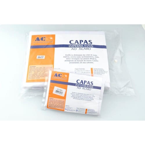 As capas envolvem o colchão e os travesseiros lacrando-o por completo, impedindo a passagem e o acúmulo de ácaros, grandes vilões das pessoas com rinite alérgica, asma ou bronquite. Além de proteger a sua saúde, as capas impermeáveis ao ácaro Allergic Center também preservam a vida útil do colchão e travesseiro. Informações Técnicas: Tamanho - Capa Colchão Casal 190x140x22,8 cm e 2 Capas Travesseiros 50x70 cm Material - Externo 100% Algodão 180 fios Interno: Impermeabilização em Policloreto de Vinila (PVC) com espessura de 0,080 mm e densidade 136g/cm³ Fechamento com zíper YKK de poliéster. Modo de Usar: - Não é necessário lavar a capa antes de ser usada. Caso haja odor do PVC deixe aberta durante 1 ou 2 dias. - Confira a metragem para que a capa não rasgue. - Vista o colchão ou travesseiro com a capa e feche o zíper com cuidado. - Coloque a roupa de cama normalmente. - Caso não esteja em uso, guardar fora do alcance de crianças, com o zíper fechado em local seco.