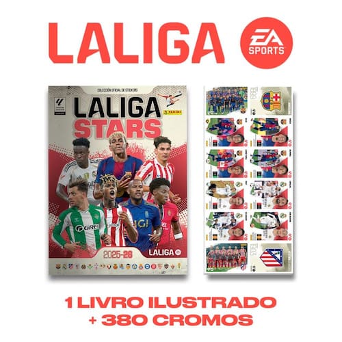 Chegou o Livro Ilustrado Oficial da temporada 2025-26 da LA LIGA! E esta é uma versão especial para os colecionadores latino-americanos, é o álbum LA LIGA STARS 2025-26. A Panini já acompanha o desdobramento deste que é um dos maiores campeonatos do mundo há muitas temporadas e, para quem não perde a chance de colecionar e saberinformações atualizadas dos grandes jogadores dos 20 clubes da Liga Espanhola, este lançamento é um verdadeiro tesouro: são 380 cromos ao todo, com 54 com acabamento especial. Entre os cromos especiais estão os craques latino-americanos que encantam a Europa: Raphinha, Julián Alvarez, Vini Jr., Endrick, Valverde, Lo Celso, Rondón entre outros, e o Hall of Fame com os jogadores que brilharam no campeonato espanhol, como Marcelo e Casemiro.