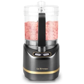 Processador de alimentos La Reveuse com 200W de potência, tigela de 450mL, controle de pulso, lâmina de aço inoxidável e dispensador de óleo embutido.