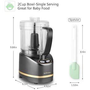 Design compacto, economia de espaço processador de alimentos de 200 watts com tigela de corte de plástico de 450 mL, porção única, ideal para preparo diário de comida e papinha de bebê Eficiente os botões de controle de pulso de um toque tornam o corte de purês simples e preciso. Lâmina de aço inoxidável afiada corta alimentos rapidamente como cebola, vegetais, frutas, ervas, pimenta, carne e muito mais Fácil de montar e limpar Estrutura totalmente desmontada, fácil montagem e limpeza. A tigela e a tampa podem ser lavadas na máquina de lavar louça apenas rack superior Conveniente este mini chopper possui um dispensador de óleo embutido. Permite adicionar líquidos à tigela durante o processamento, ótimo para temperos caseiros. Uma espátula está incluída de usar Este pequeno picador de alimentos tem tampa com trava disponível. Produto construído de acordo com os padrões elétricos norte americanos