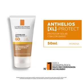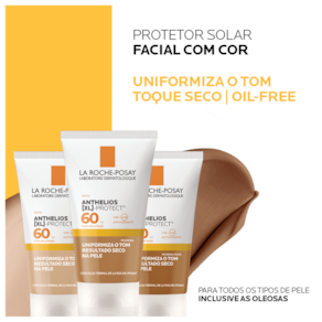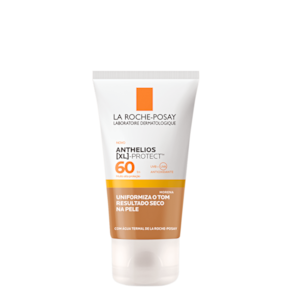 Protetor solar com cor para todos os tipos de pele. Com toque seco, Anthelios XL Protect FPS 60 uniformiza o tom e protege do envelhecimento precoce causado pela exposição solar.