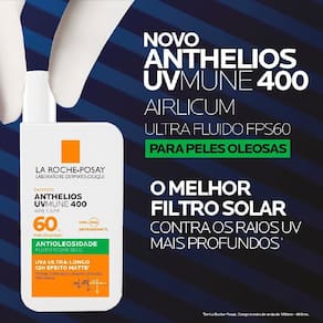 O melhor filtro solar contra os raios UV profundos1, agora também para peles oleosas. O novo Anthelios UVMune 400 Airlicium FPS60 combina a tecnologia revolucionária Mexoryl 400, o único filtro UV capaz de proteger contra os raios que penetram mais profundamente na pele, os UVA ultralongos, com a exclusiva tecnologia antioleosidade Airlicium, que garante controle + redução da oleosidade e 12 horas de efeito matte, proporcionando uma fórmula completa com muito alta proteção solar FPS60, alta resistência à água, suor e areia, e uma textura ultrafluida invisível, ideal para todos os tons de pele. 1 De La Roche-Posay. Comprimento de onda de 380nm - 400nm. Marca: Não Informado