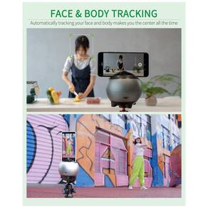 Suporte com rastreamento facial e corporal 360°, rotação automática, sem necessidade de app ou Bluetooth, bateria interna de 2500mAh com 3h de uso contínuo, interface Type-C, rosca universal para tripé.Infelizmente não temos estoque do produto que você está procurando no momento.