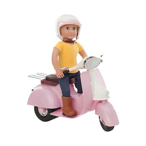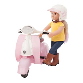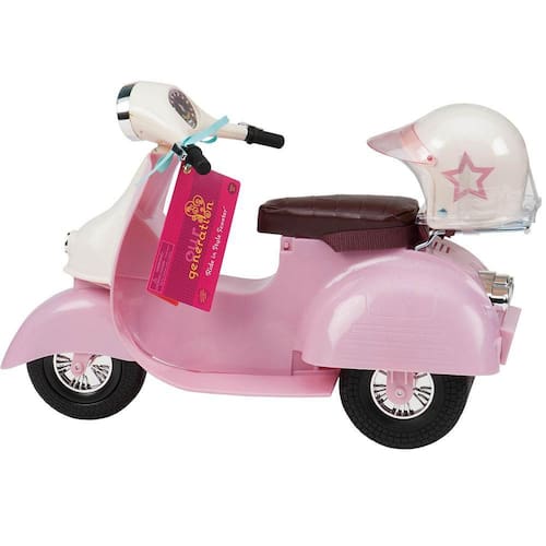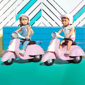 Uma scooter elegante para bonecas de 46cm que amam passear! Não se esqueça de colocar o capacete! Leve suas bonecas favoritas para uma aventura com esta clássica scooter rosa e marfim. Suas bonecas estarão seguras usando a alça do cinto de segurança e o capacete combinando, com desenho de estrela, enquanto elas saem em suas aventuras. Três rodas permitem que esta scooter fique de pé sozinha quando não está sendo empurrada, e o assento confortável é feito de vinil acolchoado! Adequada para bonecas de 46cm articuladas ou não articuladas, esta adorável scooter certamente fará suas bonecas andarem com estilo! Boneca vendida separadamente.