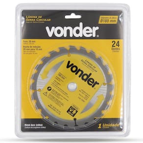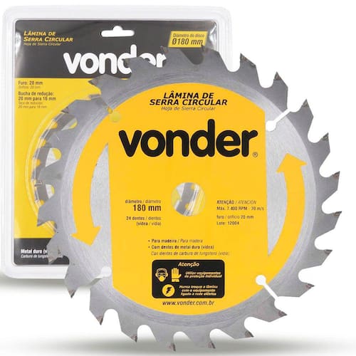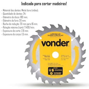 Indicada para cortar madeiras. Nunca exceder a rotação máxima (rpm) - risco de acidente e/ou queima da lâmina. Não cortar madeiras impregnadas com massa ou cimento. Para cortes em MDF, a vida útil da serra e o nível de qualidade do acabamento serão reduzidos. A Vonder disponibiliza em seu mix, serras apropriadas para cortes em MDF.