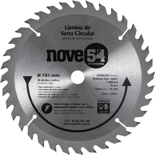 Conteúdo da embalagem: 1 Lâmina de serra circular vídea 185mm 36 dentes Nove54