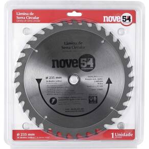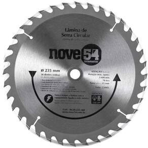 Cod. Do Fornecedor: 4668235360 Marca: Nove54 Conteúdo da embalagem: 1 Lâmina de serra circular vídea 235mm 36 dentes Nove54 Corpo em aço carbono com dentes de metal duro/vídea que proporcionam maior vida útil. Indicada para cortar madeiras. Nunca exceder a rotação máxima rpm - risco de acidente e/ou queima da lâmina. Não cortar madeiras impregnadas com massa ou cimento. Para cortes em MDF, a vida útil da serra e o nível de qualidade do acabamento serão reduzidos. legal: 90 dias Detalhes Técnicos Diâmetro externo: 235 mm Nº de dentes: 36 dentes Diâmetro do furo: 25 mm Diâmetro da bucha de redução: De 25 mm para 16 mm Material do corpo: Aço carbono Rotação máxima rpm : 5.600/min Espessura de corte: 2,6 mm Espessura do corpo: 1,7 mm Massa aproximada peso : 0,600 kg Marca: Não Informado Ean: 7893946464011