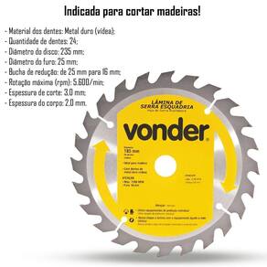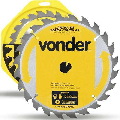 DESCRIÇÃO: Indicada para cortar madeiras. Nunca exceder a rotação máxima rpm - risco de acidente e/ou queima da lâmina. Não cortar madeiras impregnadas com massa ou cimento. Para cortes em MDF, a vida útil da serra e o nível de qualidade do acabamento serão reduzidos. A Vonder disponibiliza em seu mix, serras apropriadas para cortes em MDF. Corpo em aço carbono com dentes de metal duro/vídea que proporcionam maior vida útil.
