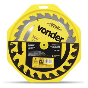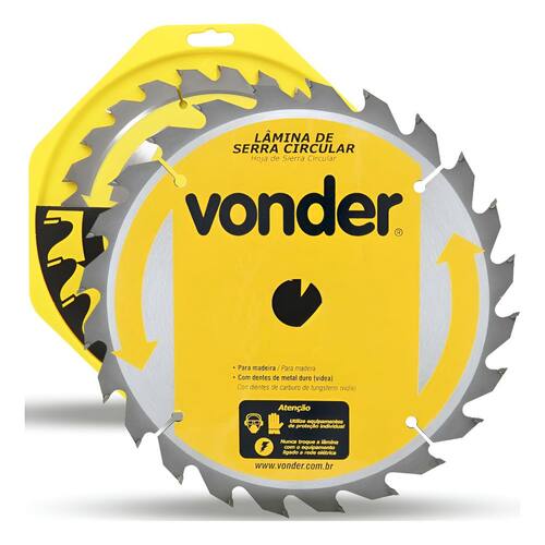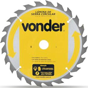 DESCRIÇÃO: Indicada para cortar madeiras. Nunca exceder a rotação máxima (rpm) - risco de acidente e/ou queima da lâmina. Não cortar madeiras impregnadas com massa ou cimento. Para cortes em MDF, a vida útil da serra e o nível de qualidade do acabamento serão reduzidos. A Vonder disponibiliza em seu mix, serras apropriadas para cortes em MDF. Corpo em aço carbono com dentes de metal duro/vídea que proporcionam maior vida útil.