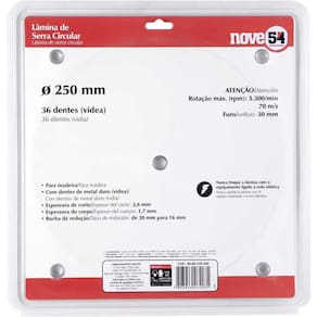 Conteúdo da embalagem: 1 Lâmina de serra circular vídea 250mm 36 dentes Nove54