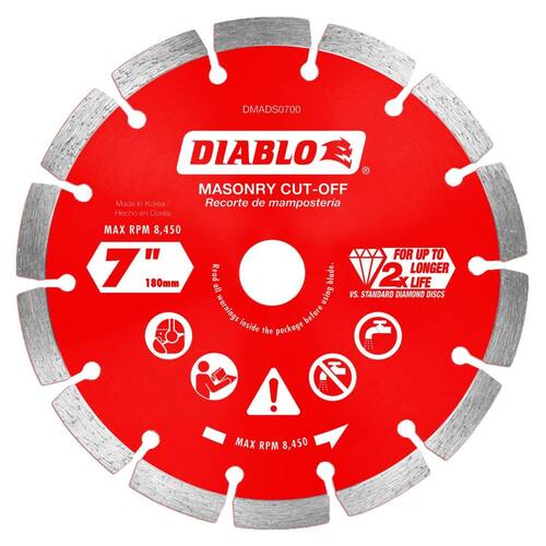 Diablo Lâmina de corte de alvenaria segmentada de diamante para concreto, tijolo e bloco - 18 cm de diâmetro, corte de 2,4 mm, 8450 RPM máximo - DMADS0700