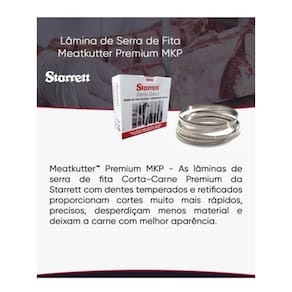 Lamina De Serra Fita Para Açougue 2,82M Caixa Com 05 Un Starret Lâmina starret para serra fita de carnes e ossos Tamanho 2,82cm Largura 1,5cm 1 caixa com 5 lâminas Ficha técnica: Serra fita 2,82m meat-kutter starrett Referência: mk5/8x6ska4-282 Código: 02654 Modelo: meatkutter tm premium Largura x espessura mm : 16 x 0,46 Largura x espessura pol : 5/8 x 0.018 Dentes por pol 25,4mm : 6 Metragem mts : 2,82 metros Meatkutter tm premium mkp As lâminas de serra de fita corta-carne premium da starrett com dentes temperados e retificados proporcionam cortes muito mais rápidos, precisos, desperdiçam menos material e deixam a carne com melhor aparência. Características Aço alto carbono com acabamento polido. Dentes retificados e temperados. Corpo temperado. Identificadas com gravação a laser no corpo da lâmina. Vantagens Alto índice de durabilidade. Cortes rápidos, suaves e limpos, com menor desperdício de material. Cortes precisos com menor esforço. Garantia de procedência e rastreabilidade. Aplicações Carnes com e sem ossos resfriadas ou congeladas. Aves, peixes. Indicada para açougues, indústria alimentícia, frigoríficos e supermercados. .