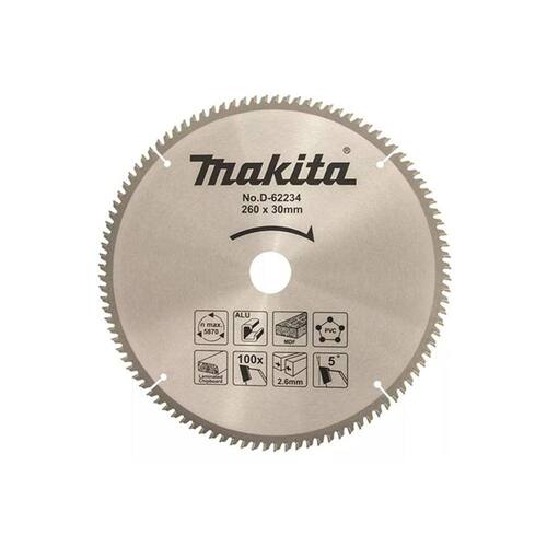 Lâmina de serra multifuncional D-62234 Makita 260 mm 100 Dentes. Lamina de serra indicada para alumínio, MDF, PVC, aglomerado. Com dentes de metal duro. Ponta de carboneto em um ângulo de 5 graus com um corte de 2,6 mm.