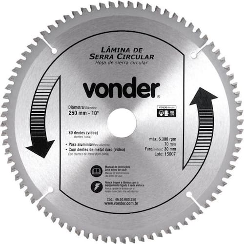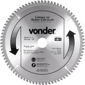 Lamina Serra Circ Vídea 250x80d 5300rpm Para Alu. Vonder Conteúdo da embalagem 1 Lâmina de serra Aplicações e dicas de uso Indicada para cortar alumínio. Nunca exceder a rotação máxima de 5.300 rpm. Destaques e diferenciais Possui dentes trapezoidais, proporcionando rapidez e melhor acabamento. Acompanha 2 buchas de redução, sendo 1 bucha de 30 mm para 20 mm e outra de 30 mm para 25,4 mm. DETALHES TÉCNICOS