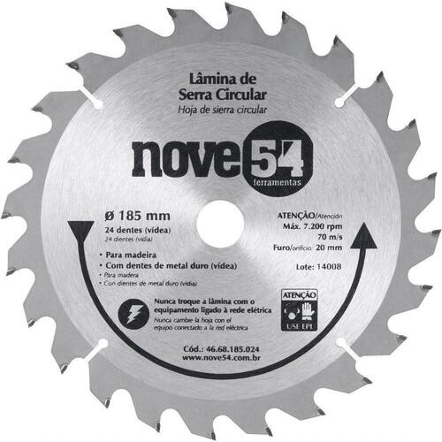 Diâmetro da lâmina de serra circular: 7.1/4 - 185 mm Número de dentes da lâmina de serra circular: 24 dentes Espessura de corte da lâmina de serra circular: 2,2 mm Espessura do corpo da lâmina de serra circular: 1,6 mm Diâmetro do furo da lâmina de serra circular: 20 mm Rotação máxima da serra circular: 7.200 rpm Velocidade periférica: 70 m/s Produto: Lamina Ean: 7893946463984