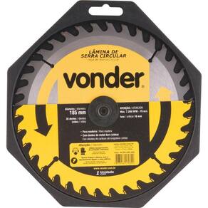 Conteúdo da embalagem1 Lâmina de serra circularAplicações e dicas de usoIndicada para cortar madeiras e derivados. Nunca exceder a rotação máxima rpm - risco de acidente e/ou queima da lâmina. Não cortar madeiras impregnadas com massa ou cimento.Destaques e diferenciaisCorpo em aço carbono com dentes de metal duro/vídea que proporcionam maior vida útil DETALHES TÉCNICOS Diâmetro da lâmina de serra circular: 10 - 250 mm Número de dentes da lâmina de serra circular: 36 dentes Espessura de corte da lâmina de serra circular: 3,2 mm Espessura do corpo da lâmina de serra circular: 2,2 mm Diâmetro do furo da lâmina de serra circular: 30 mm Rotação máxima da serra circular: 5.300 rpm Velocidade periférica: 70 m/s