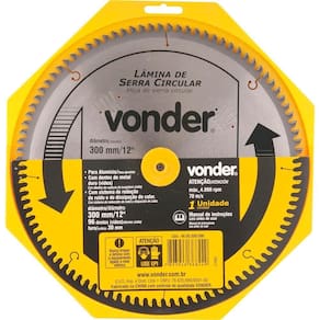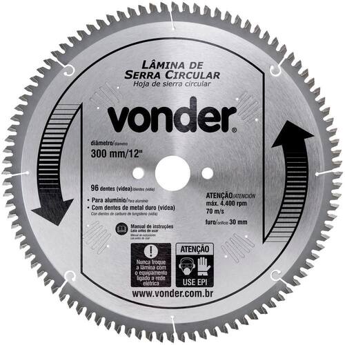 Conteúdo da embalagem1 Lâmina de serra circularAplicações e dicas de usoIndicada para cortar madeiras e derivados. Nunca exceder a rotação máxima rpm - risco de acidente e/ou queima da lâmina. Não cortar madeiras impregnadas com massa ou cimento.Destaques e diferenciaisCorpo em aço carbono com dentes de metal duro/vídea que proporcionam maior vida útil DETALHES TÉCNICOS Diâmetro da lâmina de serra circular: 12 - 300 mm Número de dentes da lâmina de serra circular: 72 dentes Espessura de corte da lâmina de serra circular: 3,8 mm Espessura do corpo da lâmina de serra circular: 2,5 mm Diâmetro do furo da lâmina de serra circular: 30 mm Rotação máxima da serra circular: 4.400 rpm Velocidade periférica: 70 m/s