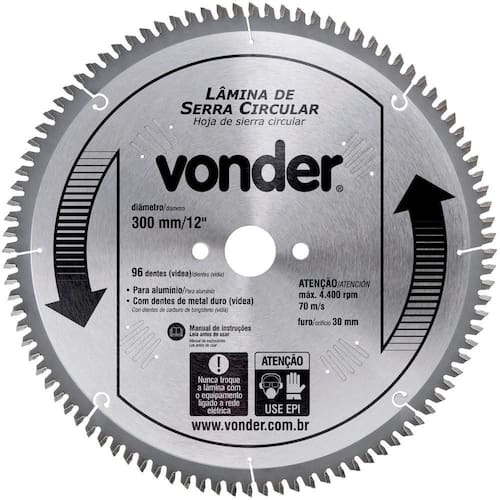 Conteúdo da embalagem1 Lâmina de serra circularAplicações e dicas de usoIndicada para cortar madeiras e derivados. Nunca exceder a rotação máxima rpm - risco de acidente e/ou queima da lâmina. Não cortar madeiras impregnadas com massa ou cimento.Destaques e diferenciaisCorpo em aço carbono com dentes de metal duro/vídea que proporcionam maior vida útil DETALHES TÉCNICOS Diâmetro da lâmina de serra circular: 12 - 300 mm Número de dentes da lâmina de serra circular: 72 dentes Espessura de corte da lâmina de serra circular: 3,8 mm Espessura do corpo da lâmina de serra circular: 2,5 mm Diâmetro do furo da lâmina de serra circular: 30 mm Rotação máxima da serra circular: 4.400 rpm Velocidade periférica: 70 m/s Marca: Não Informado