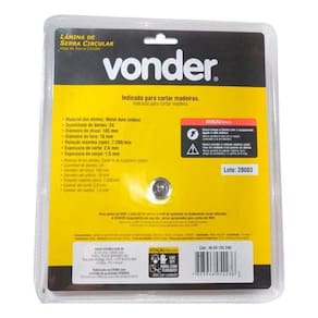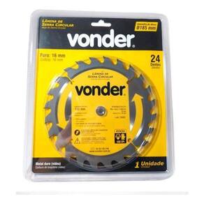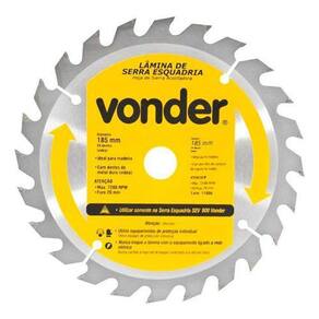Lâmina Serra Meia Esquadria Vonder 7.1/4 Para Madeira 185mm Contém: - 01 Lâmina de Serra Circular 185mm - Vonder Detalhes Técnicos: - Material dos dentes vídea : Metal Duro- Quantidade de dentes: 24- Diâmetro do disco: 185mm- Diâmetro do furo: 16mm- Rotação Máxima rpm ; 7.200/min.- Espessura de corte: 2,6mm- Espessura de corpo: 1,5mm- Velocidade periférica máx. 70 m/s- Tamanho de bucha com redução: sem bucha de redução Características: - Indicada para cortar madeiras. Nunca exceder a rotação máxima rpm - risco de acidente e/ou queima da lâmina. Não cortar madeiras impregnadas com massa ou cimento. - Para cortes em MDF, a vida útil da serra e o nível de qualidade do acabamento serão reduzidos. A Vonder disponibiliza em seu mix, serras apropriadas para cortes em MDF. - Corpo em aço carbono com dentes de metal duro/vídea que proporcionam maior vida útil.
