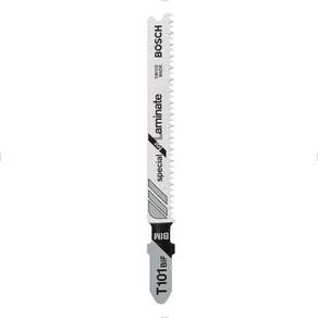 A lâmina de serra tico tico T101BIF Special for Laminate faz cortes retos limpos na madeira. Os dentes de precisão com corpo cónico fazem cortes limpos. Feita da liga bimetálica (BIM), a tira de dentes em aço rápido endurecido (HSS), especialmente formulada, está ligada a um corpo de aço carbono (HCS) muito flexível, o que torna a lâmina ideal ao corte de materiais duros como assoalho e piso laminado. Além disso, um desenho do dente pontiagudo reduz a quebra. Está equipada com um passo dos dentes fino (1,7 mm) e corta diversos materiais de madeira sólidos com 2-30 mm de espessura. Para utilizar com serras tico tico compatíveis com encaixe em T.