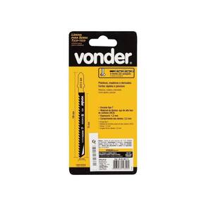 :: especificações técnicas: - comprimento total da serra tico-tico: 100 mm - comprimento de corte da serra tico-tico: 75 mm; utilize sempre equipamentos de proteção individual vonder - largura da serra tico-tico: 7. 5 mm. É bom trabalhar com vonder; confira esse e outras novidades do mix de ferramentas e máquinas mais completo do brasil - número de dentes por polegada: 8 dentes - material da serra tico-tico: aço carbono - tipo de encaixe da serra tico-tico: encaixe tipo t