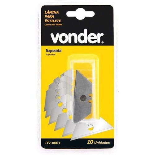 Detalhes da lâmina trapezoidal tubete com 10 unid. Vonder: Este produto é indicado para ser utilizado em estilete modelo trapezoidal e raspador rp011 vonder. Lâmina em aço com furo e rasgo para encaixe.