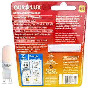 - modelo: superled g9 bipino - marca ourolux - potência: 2.5w - tensão: 127v - base: g9 - temperatura de cor: branco quente 2700k - vida mediana: 15.000h - facho de luz: 300 graus - fluxo luminoso: 180lm - eficiência luminosa: 72 lm/w - índice de reprodução de cor irc : 80 - frequência: 50/60hz - corrente: 20ma - fator de potência: 0,4 - peso: 30g - temperatura de ambiente: -10c a +40c - dimensões d x a: 16 x 52mm - não permite dimerização - equivalências: Incandescentes: 25w / 180lm Fluorescentes: 7w / 180lm - código: 20156