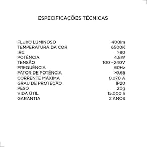 Marca: Opus Despacho: Imediato Fluxo Luminoso: 400 lm Temperatura da Cor: 6500k IRC: 80 Potência: 4.8W Tensão: 100/240V Frequência: 60 Hz Fator de Potência: 0.65 Corrente Máxima: 0,070 A Grau de Proteção: IP20 Peso: 20g Medidas Alt. Larg. : 7,3cm x 4,5cm Garantia de Loja: 3 meses Ean: 7898589034188