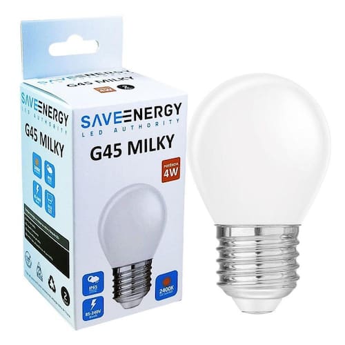 - modelo led mini bulbo g45 - marca save energy - potência: 4w - base: e27 - bulbo branco leitoso bolinha - temperatura de cor: branco quente2400k - tensão: 85-240v bivolt - ângulo de abertura: 360 - vida útil: 15.000h - fluxo luminoso: 360lm - irc: 80 - frequência: 60hz - corrente: 78ma 127v e 45ma 220v - fator de potência: 0,5 - índice de proteção: ip65 adequada para ambiente externo, suporta chuva e intempéries do tempo. - não permite dimerização - dimensões: 45mm d x 74mm a - peso: 17g - equivalências: incandescente 40w e fluorescente 12w - código: se-375.2331