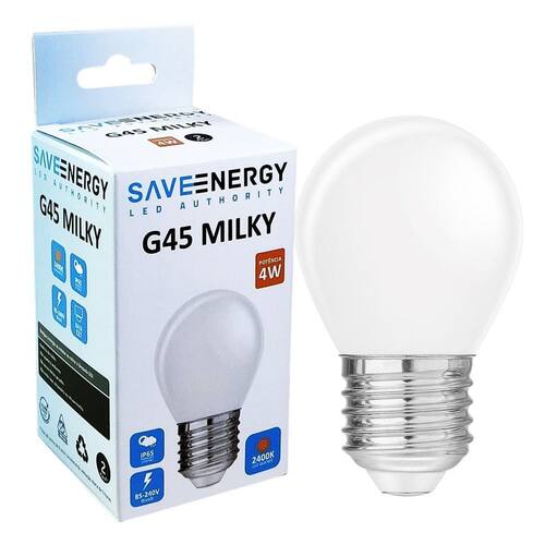 - modelo led mini bulbo g45 - marca save energy - potência: 4w - base: e27 - bulbo branco leitoso bolinha - temperatura de cor: branco quente2400k - tensão: 85-240v bivolt - ângulo de abertura: 360 - vida útil: 15.000h - fluxo luminoso: 360lm - irc: 80 - frequência: 60hz - corrente: 78ma 127v e 45ma 220v - fator de potência: 0,5 - índice de proteção: ip65 adequada para ambiente externo, suporta chuva e intempéries do tempo. - não permite dimerização - dimensões: 45mm d x 74mm a - peso: 17g - equivalências: incandescente 40w e fluorescente 12w - código: se-375.2331