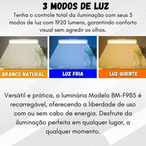 ------------------ Especificações ------------------ Modelo: bm-f985 Quantidade de leds: 28 14 branco frio e 14 branco quente . Controle: botão on/off para alternar entre as 3 tonalidades e ajustar a luminosidade. Instalação: base magnética com tira dupla face para fácil fixação. Fonte de alimentação: recarregável via usb. Ajuste de 90º 3 modo de luz