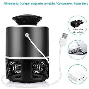 Lâmpada de assassino de mosquito eletrônica usb power anti-mosquito fly inhaler inseto mosquito 365 -pt Projetado para ser ligado em seu quarto ao anoitecer, por volta de 3 horas antes de dormir. Ele usa uma luz especial ultra violeta para atrair o mosquito e um ventilador / fan que o "suga" para dentro do dispositivo ao chegar perto, onde ele morre por desidratação. Cobertura de 360°: ele possui 4 leds uv que ilumina em 360°, atraindo os mosquitos de todos os cantos do ambiente.Cor violeta: seu led envia uma onda de luz violeta/neon de 365nm, projetada para aumentar a atratividade aos mosquitos.Cooler: possui um ventilador embutido que faz a sucção dos mosquitos em 360° para dentro da armadilha, onde morrem por desidratação.Alimentação via usb: poderá liga-lo diretamente em uma porta usb de seu computador ou power bank bateria portátil . Não acompanha adaptador para tomadas.Baixo nível de ruído: o mata mosquito possui a tecnologia denoise, que reduz os ruídos da ventoinha do produto a apenas 35db uma fala normal alcança 60db .Fácil de limpar: basta girar a parte de baixo para abrir o mata mosquito e fazer a limpeza do reservatório da forma que preferir.Bebês e crianças: seu som baixo e contínuo ajuda a prolongar o sono dos bebês e crianças pequenas, assim como o som contínuo de um ar condicionado ajuda muitos adultos.Sem cheiro: ao contrário dos mata mosquitos elétricos que ao grudar ficam "fritando" e soltando cheiro de queimado, este não solta nenhum cheiroAparelho mata mosquito - ambientes fechadosAlimentação via cabo usb, fonte não inclusa Dicas de utilização:Para obter o melhor resultado na captura dos mosquitos, deixe o mata mosquito ligado continuamente por mais de 12 horas durante o primeiro uso.Desligue todas as luzes e deixe o quarto bem escuro, assim sua luz violeta irá atrair mais mosquitos.Feche as portas e janelas e ligue o mata mosquito cerca de 3 horas antes de ir dormir para melhores resultados.