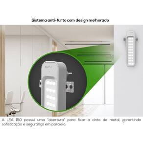 Características gerais - instalação sem fio: a lea 150 é conectada diretamente na parede, ou seja, dispensa a fixação com parafusos. - mais luminosidade: produto com 50% mais eficiência. Atualmente, possui o melhor desempenho do mercado, com um total de 30 leds. - acendimento automático - autonomia de 6 horas: mais luminosidade, com a mesma autonomia. A lea 150 garante a iluminação por até 6 horas (fluxo mínimo). - sistema antifurto com design melhorado: possui uma “abertura” para fixar a cinta de metal, garantindo sofisticação e segurança em paralelo.