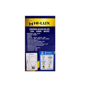 base : e27 tensão : bivolt automático 100v - 240v ângulo de abertura : 180 graus potência : 12w fluxo luminoso : 1080 lumens temperatura de cor : 6500k emissão de cor : branca equivalência : incandescente 75w / fluorescente 20w dimensões : 108mm x 60mm Marca: Hi-Lux Ean: 0609963686223