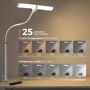 - ?25 modos de brilho múltiplos e função de memória? Esta luz de mesa de cabeça dupla oferece 5 temperaturas de cor (3000K-6500K) e 5 modos de brilho reguláveis (20%-100%). Além disso, possui uma função de memória inteligente que retém o modo anterior quando ligado novamente, lembrando sua última configuração para maior conveniência.