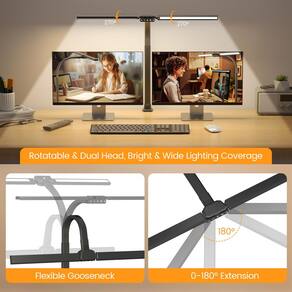 - ?Cabeça de lâmpada rotativa e cobertura ultralarga?Esta lâmpada de mesa RGB de cabeça dupla, projetada com 2 braços oscilantes flexíveis, que podem ser estendidos até 180° a 31,5 polegadas, girando livremente 270° na frente e atrás, permitindo que você gire a luz da mesa em qualquer ângulo para fornecer a faixa de iluminação mais adequada. E com o pescoço de ganso dobrável, pode cobrir uniformemente uma mesa com uma largura de 180 cm, proporcionando iluminação suficiente e confortável.