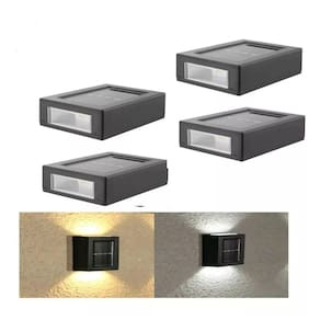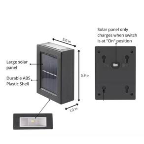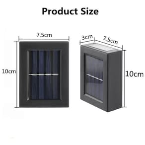 DESCRIÇÃO DO PRODUTO: Lâmpada de parede 4 unidades Fonte de luz: 2 luzes LED SMD (luzes superior e inferior) Tempo de carregamento: Ligue o interruptor e mantenha o sol por mais de 6 horas Bateria: Ni-MH 600mAhCor da luz: luz quente, branca. Painel solar: painel solar de 2 V/200 m Material plástico ABS mais PC (anticorrosivo) Tempo de iluminação: 8 horas após o carregamento completo\ nCor do corpo da luz: escudo preto\ NCenas aplicáveis: iluminação decorativa para terraços, parques e jardins
