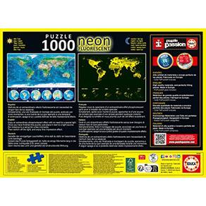 Mapa mundial de quebra-cabeça de 1000 peças de néon, um quebra-cabeça fluorescente que brilha no escuro. Tamanho aproximado do quebra-cabeça montado: 68 x 48 cm.