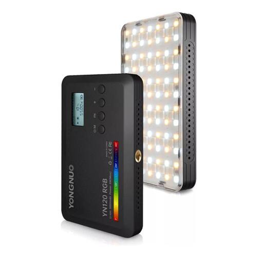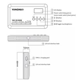 ********************* descrição do produto ******************** marca: yongnuo modelo do item: yn120 cor: preto material: abs peso do item: 121 g tamanho do item: 16 * 108 * 66 mm tela de exibição: tela lcd de 0,96 polegadas 73mp0 de espera: 1,5-10 h bateria: 3000 mah w: 8w modo de luz de cena: 31 tipos ajuste de lum1nosidade: 1% -100% lum1nosidade: 2159lux (0,3 m) interface de carregamento: tipo c temperatura de cor: 2500k-100% esf3ras de led 9900k: 120 peças: 42 unidades de contas quentes, 42 peças de contas frias, 36 peças de contas rgb cri: igual ou maior que 95ra lista de embalagem: 1* lâmpada de vídeo led 1 1* caixa de silicone 1 1* cold shoe svp0rte 1 * cabo de carregamento 1 * adesivo 1 * m4nv4l