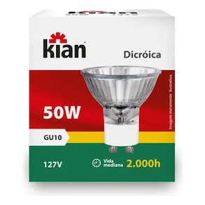 Lâmpada halógena dicróica gu10 50w 220v 3000k - luz amarela - Lâmpada halógena dicróica gu10 50w 220v Ideal para quem busca iluminação eficiente e acolhedora, a lâmpada halógena dicróica gu10 50w 220v é perfeita para ambientes internos como salas de estar, quartos e escritórios. Ela proporciona uma atmosfera convidativa e elegante, realçando a decoração e criando um ambiente confortável para relaxar ou receber visitas. Principais características: Base: gu10 encaixe prático e seguro, sem necessidade de transformador Potência: 50w Tensão: 220v Temperatura de cor: 3.000k luz branca quente - ideal para criar ambientes aconchegantes Vida útil mediana: 2.000 horas Grau de proteção: ip20 uso em ambientes internos, protegido contra partículas sólidas médias Índice de reprodução de cor irc : 100 fidelidade total na reprodução das cores Facho de luz: direcionado, perfeito para iluminação de destaque e efeito decorativo Compatibilidade: pode ser Utilizado em embutidos, spots, trilhos e luminárias decorativas Benefícios: Atmosfera aconchegante: a luz branca quente 3000k proporciona sensação de conforto e relaxamento, ideal para áreas de convivência. Excelente reprodução de cores: com irc 100, as cores dos objetos iluminados são vistas de forma mais viva e verdadeira, valorizando a decoração. Instalação simples: base gu10 de encaixe rápido, dispensando equipamentos adicionais. Foco direcionado: ótima para iluminação de destaque, realçando pontos específicos como quadros, esculturas ou móveis. Durabilidade: vida útil mediana de 2.000 horas, oferecendo bom desempenho e reduzindo a frequência de trocas. Características gerais do produto: Marca: kian Emissão de luz: 3000k Voltagem: 220v Vida útil: 2.000h Base: gu10 Potência: 50w Irc índice de reprodução de cor : 100 Material: vidro, alumínio Acompanha o produto: 1 lâmpada dicróica gu10 50w. : 3 meses fabricante