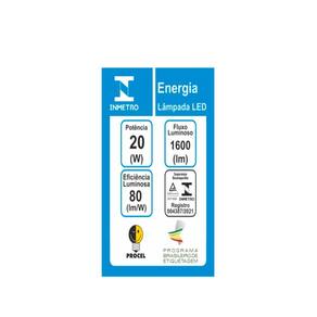 SOBRE O PRODUTO Lâmpada LED de alto desempenho com soquete E27 e excelente eficiência energética. Emite luz branca fria (6500K), ideal para ambientes que exigem maior claridade. Possui 20W de potência, oferecendo alta luminosidade com baixo consumo. Estrutura robusta e durável, ideal para uso contínuo. Produto de fácil instalação, indicado para uso residencial e comercial.